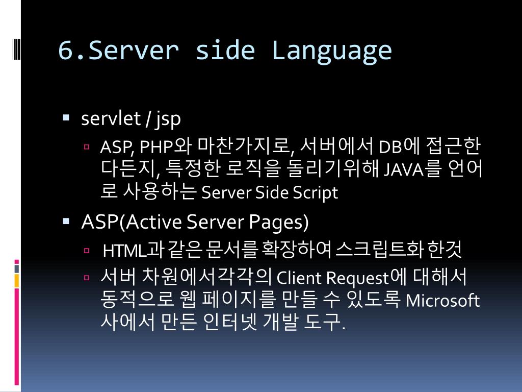 6.Server side Language • servlet/ jsp • ASP, PHP와 마찬가지로, 서버에서 DB에 접근한다든지, 특정한 로직을돌리기위해JAVA를 언어로 사용하는 Server Side Script • ASP(Active Server Pages) • HTML과 같은 문서를 확장하여 스크립트화 한것 • 서버 차원에서각각의 Client Request에 대해서 동적으로 웹 페이지를 만들 수 있도록 Microsoft사에서 만든 인터넷 개발 도구.