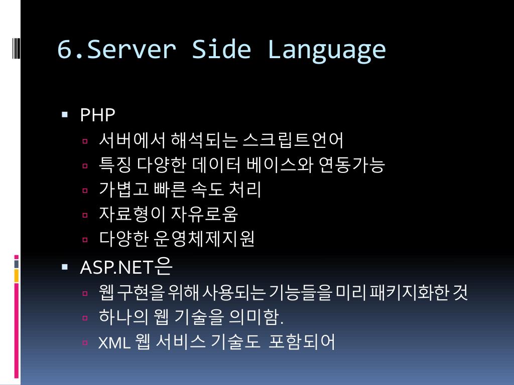 6.Server Side Language • PHP • 서버에서 해석되는 스크립트언어 • 특징 다양한 데이터 베이스와 연동가능 • 가볍고 빠른 속도 처리 • 자료형이 자유로움 • 다양한 운영체제지원 • ASP.NET은 • 웹 구현을 위해 사용되는 기능들을 미리 패키지화한 것 • 하나의 웹 기술을 의미함. • XML 웹 서비스 기술도 포함되어