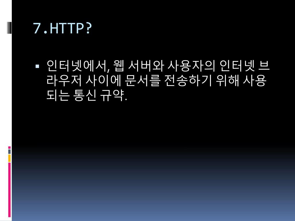 7.HTTP? • 인터넷에서, 웹 서버와 사용자의 인터넷 브라우저 사이에 문서를 전송하기 위해 사용되는 통신 규약.