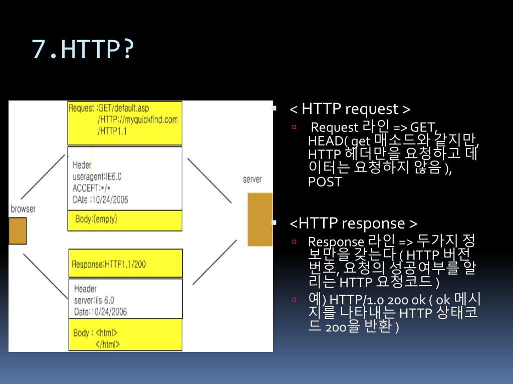 7.HTTP? • < HTTP request > • Request 라인 => GET, HEAD( get 매소드와 같지만, HTTP 헤더만을 요청하고 데이터는 요청하지 않음 ), POST • <HTTP response > • Response 라인 => 두가지 정보만을 갖는다 ( HTTP 버전 번호, 요청의 성공여부를 알리는 HTTP 요청코드 ) • 예) HTTP/1.0 200 ok ( ok 메시지를 나타내는 HTTP 상태코드 200을 반환 )