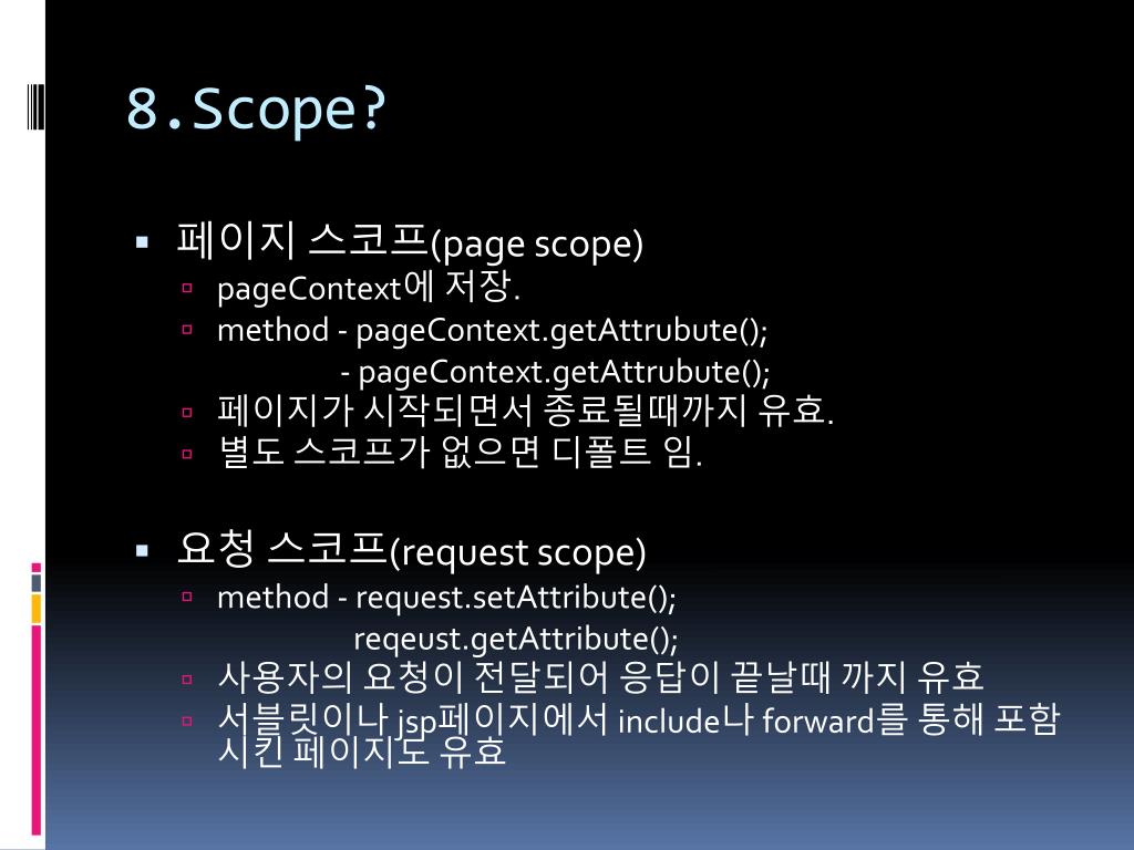 8.Scope? • 페이지 스코프(page scope) • pageContext에 저장. • method - pageContext.getAttrubute(); - pageContext.getAttrubute(); • 페이지가 시작되면서 종료될때까지 유효. • 별도 스코프가 없으면 디폴트 임. • 요청 스코프(request scope) • method - request.setAttribute(); reqeust.getAttribute(); • 사용자의 요청이 전달되어 응답이 끝날때 까지 유효 • 서블릿이나jsp페이지에서 include나 forward를 통해 포함 시킨 페이지도 유효