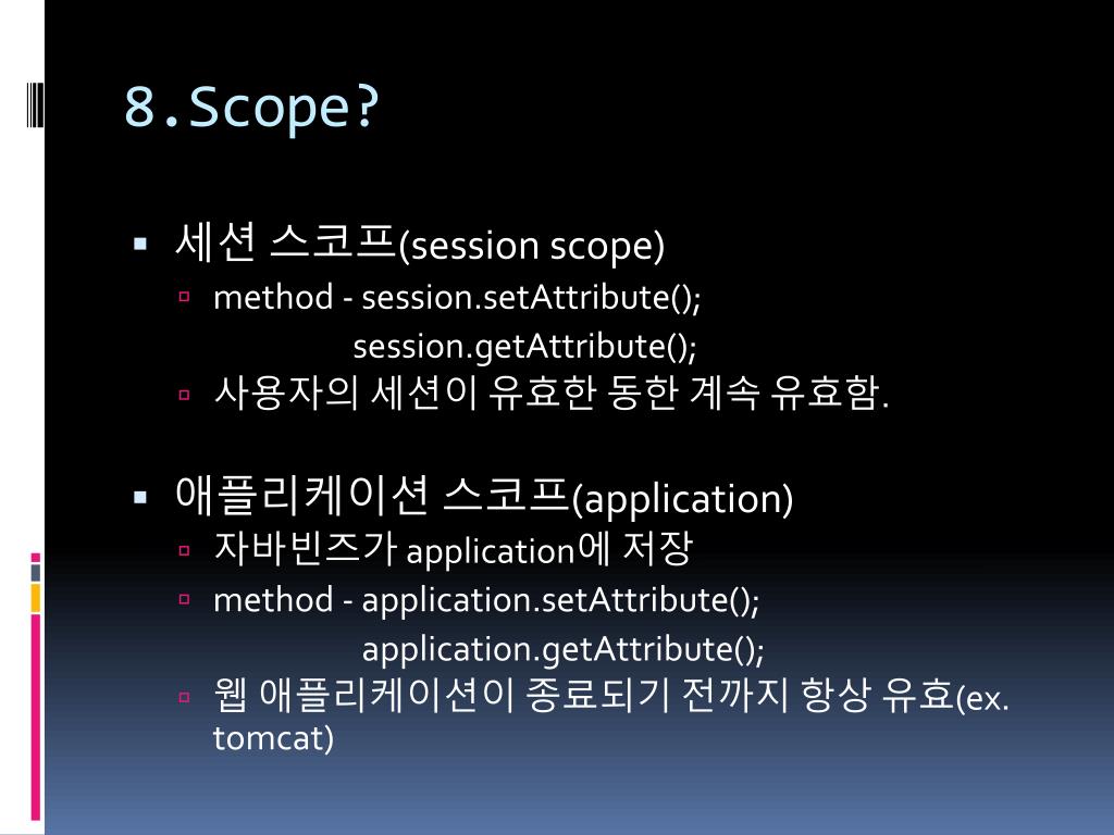 8.Scope? • 세션 스코프(session scope) • method - session.setAttribute(); session.getAttribute(); • 사용자의 세션이 유효한 동한 계속 유효함. • 애플리케이션 스코프(application) • 자바빈즈가application에 저장 • method - application.setAttribute(); application.getAttribute(); • 웹 애플리케이션이 종료되기 전까지 항상 유효(ex. tomcat)
