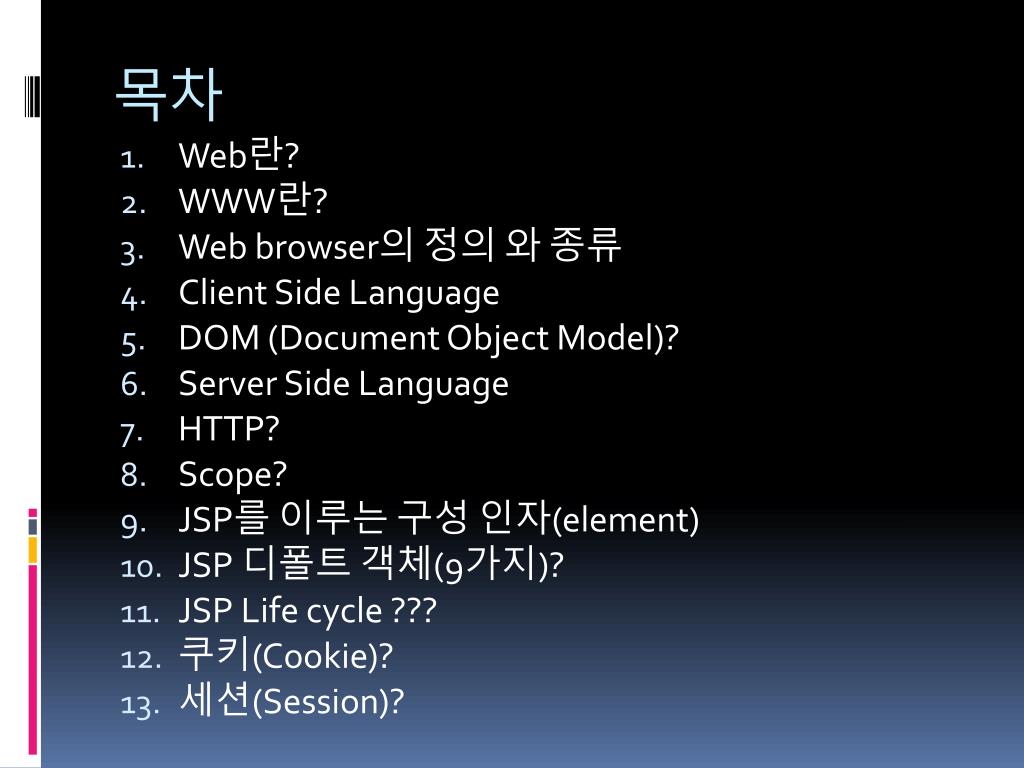 목차 • Web란? • WWW란? • Web browser의 정의 와 종류 • Client Side Language • DOM (Document Object Model)? • Server Side Language • HTTP? • Scope? • JSP를 이루는 구성 인자(element) • JSP 디폴트 객체(9가지)? • JSP Life cycle ??? • 쿠키(Cookie)? • 세션(Session)?