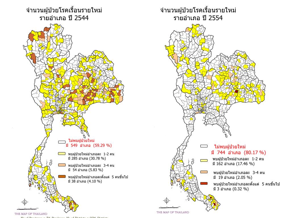 จำนวนผู้ป่วยโรคเรื้อนรายใหม่ รายอำเภอปี 2544 จำนวนผู้ป่วยโรคเรื้อนรายใหม่ รายอำเภอปี 2554 ไม่พบผู้ป่วยใหม่ มี 549 อำเภอ (59.29 %) ไม่พบผู้ป่วยใหม่ มี 744 อำเภอ (80.17 %) พบผู้ป่วยใหม่อำเภอละ 1-2 คน มี285 อำเภอ (30.78 %) พบผู้ป่วยใหม่อำเภอละ 1-2 คน มี162 อำเภอ (17.46 %) พบผู้ป่วยใหม่อำเภอละ 3-4 คน มี 54 อำเภอ (5.83%) พบผู้ป่วยใหม่อำเภอละ 3-4 คน มี 19 อำเภอ (2.05 %) พบผู้ป่วยใหม่อำเภอละตั้งแต่ 5 คนขึ้นไป มี 38 อำเภอ (4.10%) พบผู้ป่วยใหม่อำเภอละตั้งแต่ 5 คนขึ้นไป มี 3 อำเภอ (0.32%)