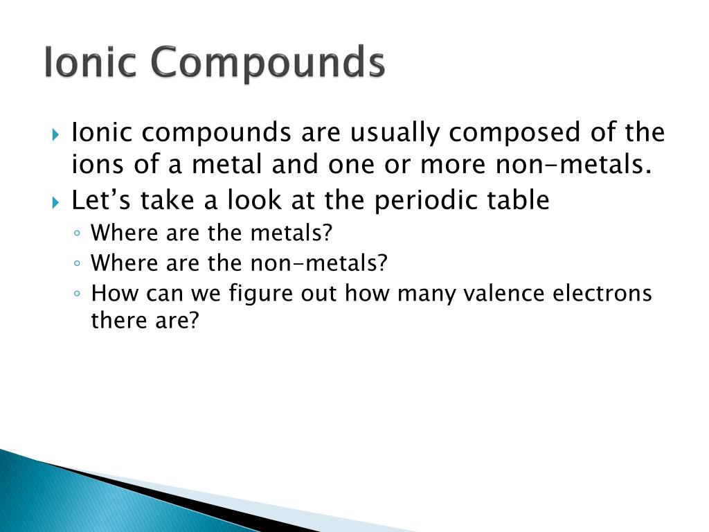 Ionic Compounds • Ionic compounds are usually composed of the ions of a metal and one or more non-metals. • Let’s take a look at the periodic table • Where are the metals? • Where are the non-metals? • How can we figure out how many valence electrons there are?