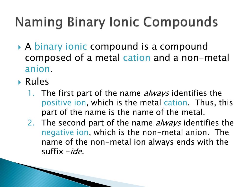Naming Binary Ionic Compounds • A binary ionic compound is a compound composed of a metal cation and a non-metal anion. • Rules • The first part of the name always identifies the positive ion, which is the metal cation. Thus, this part of the name is the name of the metal. • The second part of the name always identifies the negative ion, which is the non-metal anion. The name of the non-metal ion always ends with the suffix –ide.