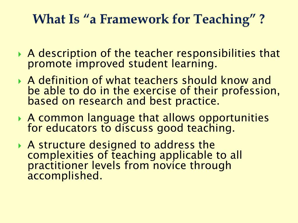 What Is “a Framework for Teaching” ? • A description of the teacher responsibilities that promote improved student learning. • A definition of what teachers should know and be able to do in the exercise of their profession, based on research and best practice. • A common language that allows opportunities for educators to discuss good teaching. • A structure designed to address the complexities of teaching applicable to all practitioner levels from novice through accomplished.