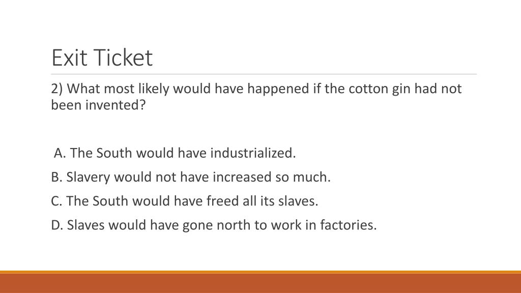 Exit Ticket • 2) What most likely would have happened if the cotton gin had not been invented? A. The South would have industrialized. • B. Slavery would not have increased so much. • C. The South would have freed all its slaves. • D. Slaves would have gone north to work in factories.