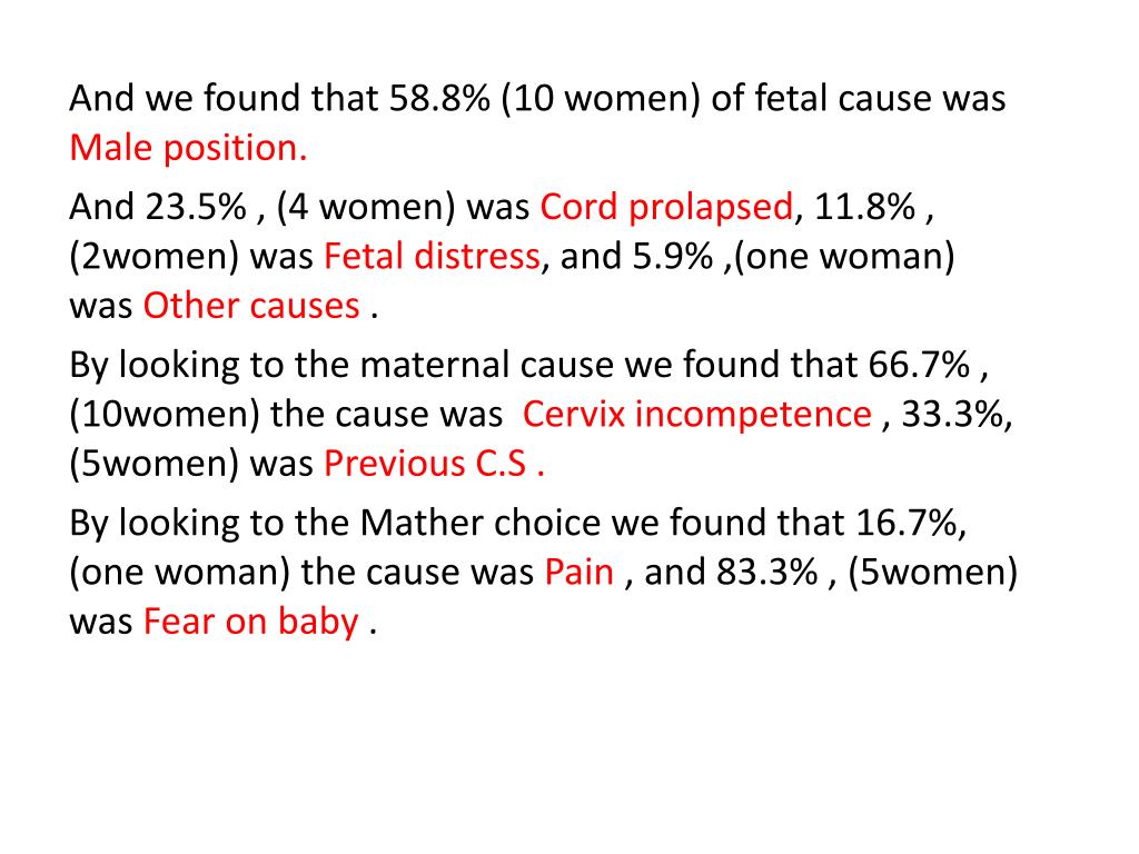 And we found that 58.8% (10 women) of fetal cause was Male position. And 23.5% , (4 women) was Cord prolapsed, 11.8% , (2women) was Fetal distress, and 5.9% ,(one woman) was Other causes . By looking to the maternal cause we found that 66.7% , (10women) the cause was Cervix incompetence , 33.3%, (5women) was Previous C.S . By looking to the Mather choice we found that 16.7%, (one woman) the cause was Pain , and 83.3% , (5women) was Fear on baby .