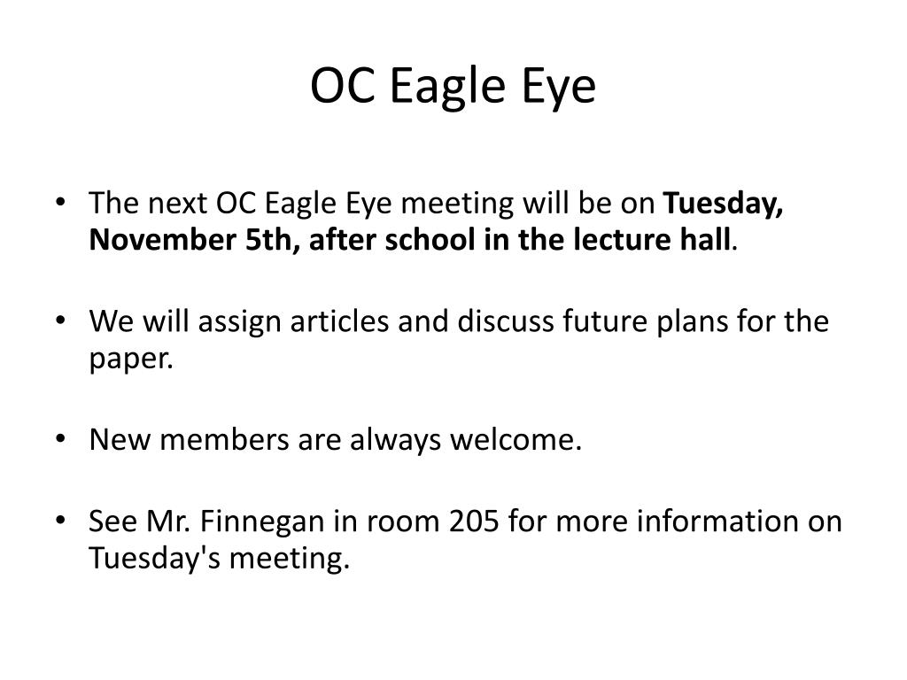 OC Eagle Eye • The next OC Eagle Eye meeting will be on Tuesday, November 5th, after school in the lecture hall. • We will assign articles and discuss future plans for the paper. • New members are always welcome. • See Mr. Finnegan in room 205 for more information on Tuesday's meeting.
