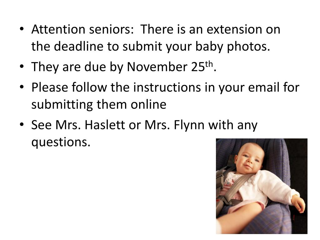 Attention seniors: There is an extension on the deadline to submit your baby photos. • They are due by November 25th. • Please follow the instructions in your email for submitting them online • See Mrs. Haslett or Mrs. Flynn with any questions.