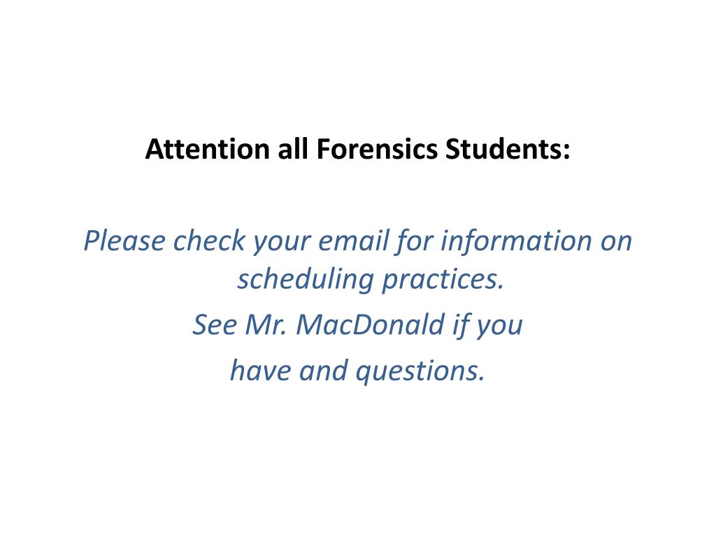 Attention all Forensics Students: Please check your email for information on scheduling practices. See Mr. MacDonald if you have and questions.