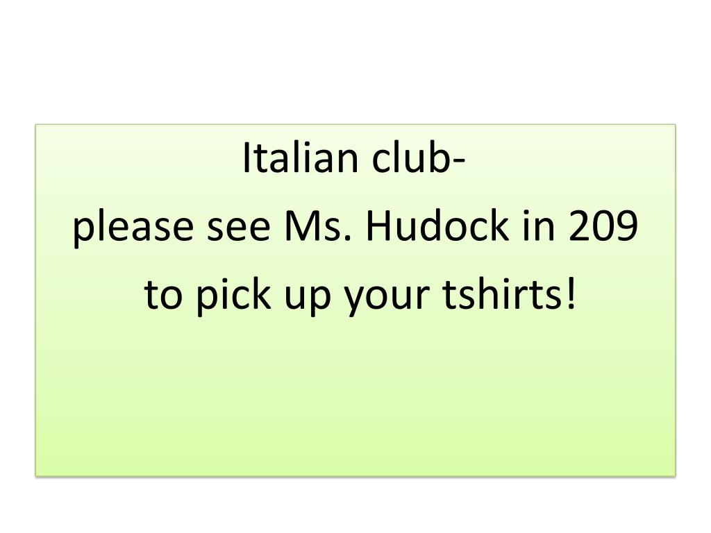 Italian club- please see Ms. Hudock in 209 to pick up your tshirts!