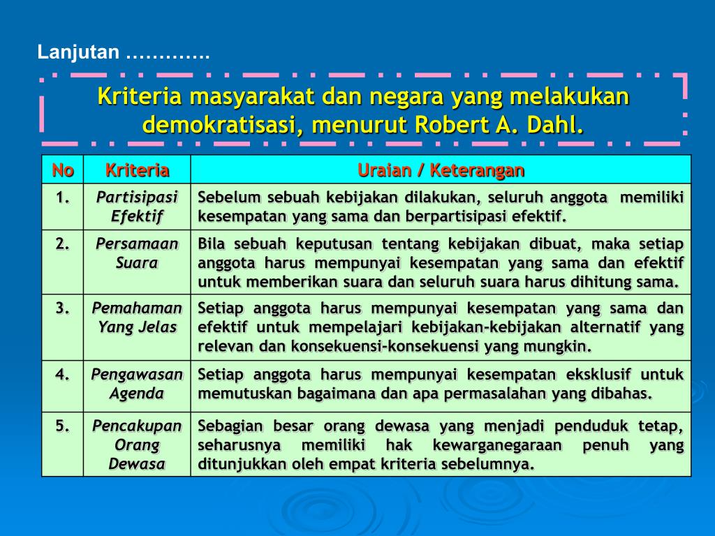 Lanjutan …………. Kriteria masyarakat dan negara yang melakukan demokratisasi, menurut Robert A. Dahl.