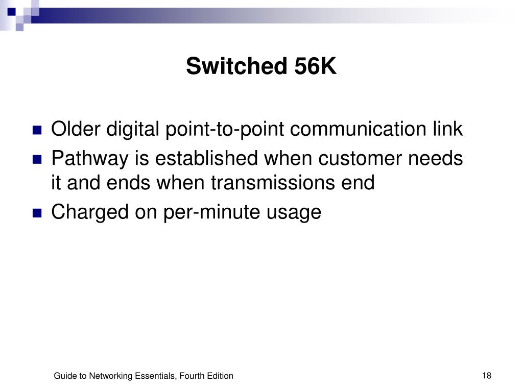 Switched 56K • Older digital point-to-point communication link • Pathway is established when customer needs it and ends when transmissions end • Charged on per-minute usage Guide to Networking Essentials, Fourth Edition