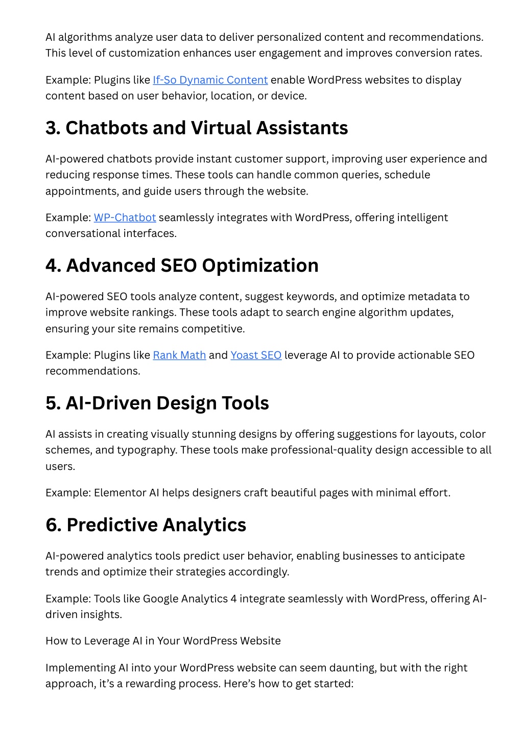 AI algorithms analyze user data to deliver personalized content and recommendations. This level of customization enhances user engagement and improves conversion rates. Example: Plugins like If-So Dynamic Content enable WordPress websites to display content based on user behavior, location, or device. 3. Chatbots and Virtual Assistants AI-powered chatbots provide instant customer support, improving user experience and reducing response times. These tools can handle common queries, schedule appointments, and guide users through the website. Example: WP-Chatbot seamlessly integrates with WordPress, o?ering intelligent conversational interfaces. 4. Advanced SEO Optimization AI-powered SEO tools analyze content, suggest keywords, and optimize metadata to improve website rankings. These tools adapt to search engine algorithm updates, ensuring your site remains competitive. Example: Plugins like Rank Math and Yoast SEO leverage AI to provide actionable SEO recommendations. 5. AI-Driven Design Tools AI assists in creating visually stunning designs by o?ering suggestions for layouts, color schemes, and typography. These tools make professional-quality design accessible to all users. Example: Elementor AI helps designers craft beautiful pages with minimal e?ort. 6. Predictive Analytics AI-powered analytics tools predict user behavior, enabling businesses to anticipate trends and optimize their strategies accordingly. Example: Tools like Google Analytics 4 integrate seamlessly with WordPress, o?ering AI- driven insights. How to Leverage AI in Your WordPress Website Implementing AI into your WordPress website can seem daunting, but with the right approach, it’s a rewarding process. Here’s how to get started: