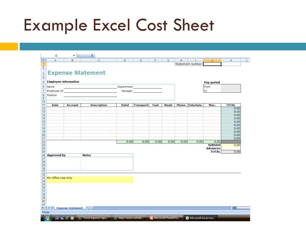 Week Three: Cost Sheet Activity Two: • The teacher will show the students examples of cost sheets. • The teacher will demonstrate how to create a Cost Sheet using Excel. • TSW create a cost sheet using Microsoft Excel. The cost sheet is a budget of all trip expenses including: transportation costs, lodging costs, meal cost per day, entertainment and activity costs, and miscellaneous costs.