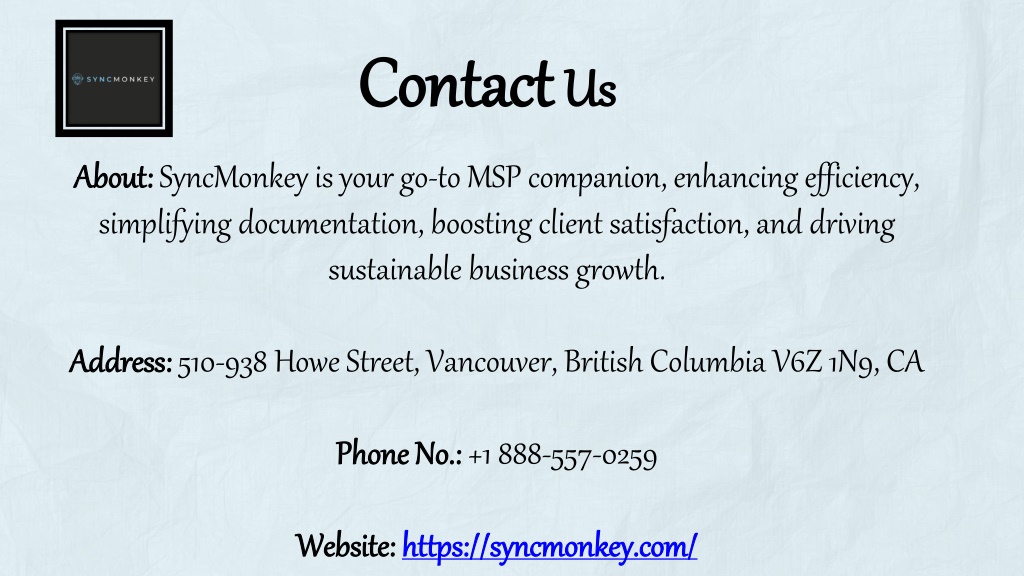 Contact Us About: SyncMonkey is your go-to MSP companion, enhancing efficiency, simplifying documentation, boosting client satisfaction, and driving sustainable business growth. Address: 510-938 Howe Street, Vancouver, British Columbia V6Z 1N9, CA Phone No.: +1 888-557-0259 Website: https://syncmonkey.com/