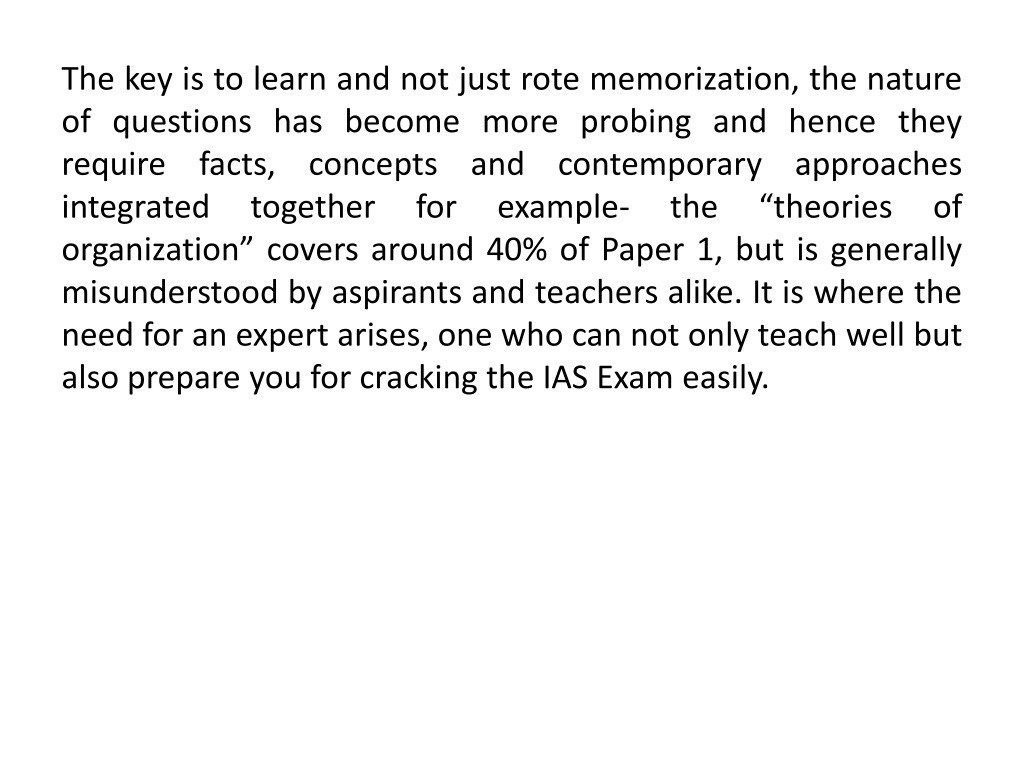 The key is to learn and not just rote memorization, the nature of questions has become more probing and hence they require facts, concepts and contemporary approaches integrated together for example- the “theories of organization” covers around 40% of Paper 1, but is generally misunderstood by aspirants and teachers alike. It is where the need for an expert arises, one who can not only teach well but also prepare you for cracking the IAS Exam easily.