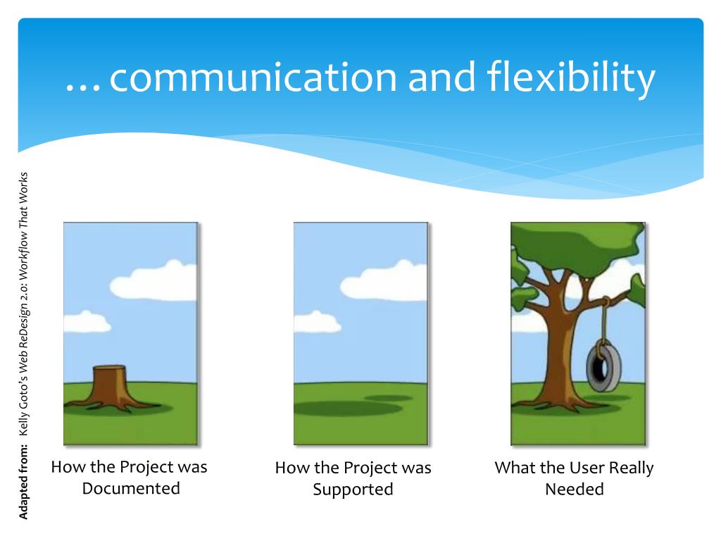 …communication and flexibility Adapted from: Kelly Goto’sWeb ReDesign 2.0: Workflow That Works How the Project was Documented How the Project was Supported What the User Really Needed