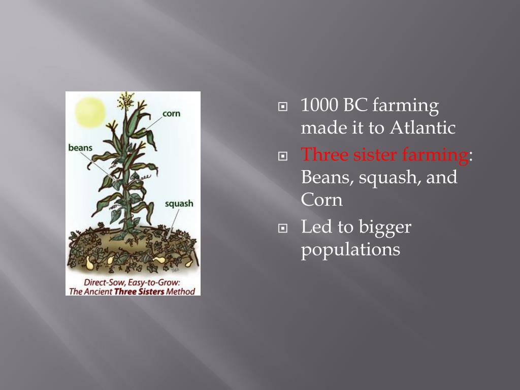 1000 BC farming made it to Atlantic • Three sister farming: Beans, squash, and Corn • Led to bigger populations