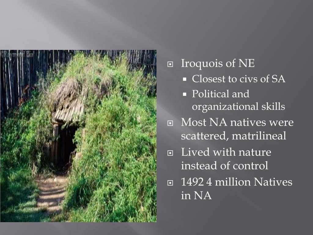 Iroquois of NE • Closest to civs of SA • Political and organizational skills • Most NA natives were scattered, matrilineal • Lived with nature instead of control • 1492 4 million Natives in NA