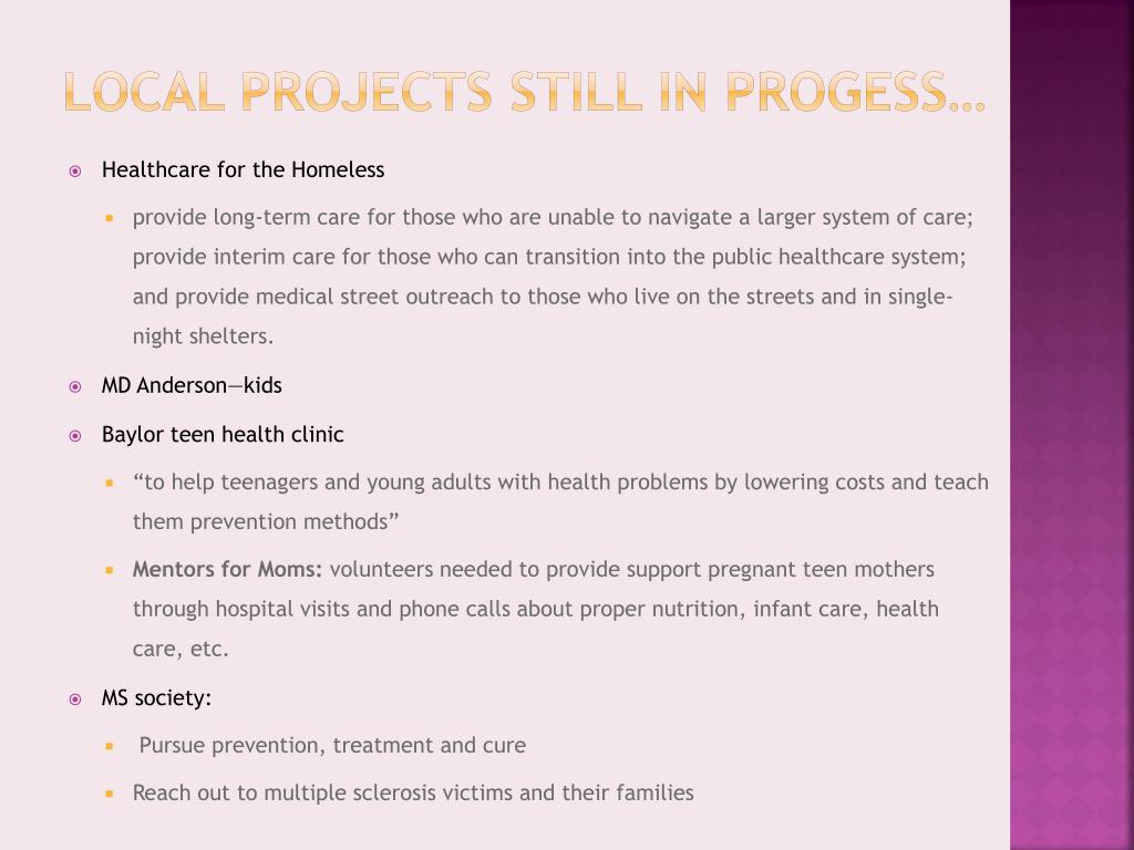 Local projects Still in Progess… • Healthcare for the Homeless • provide long-term care for those who are unable to navigate a larger system of care; provide interim care for those who can transition into the public healthcare system; and provide medical street outreach to those who live on the streets and in single-night shelters. • MD Anderson—kids • Baylor teen health clinic • “to help teenagers and young adults with health problems by lowering costs and teach them prevention methods” • Mentors for Moms: volunteers needed to provide support pregnant teen mothers through hospital visits and phone calls about proper nutrition, infant care, health care, etc. • MS society: • Pursue prevention, treatment and cure • Reach out to multiple sclerosis victims and their families