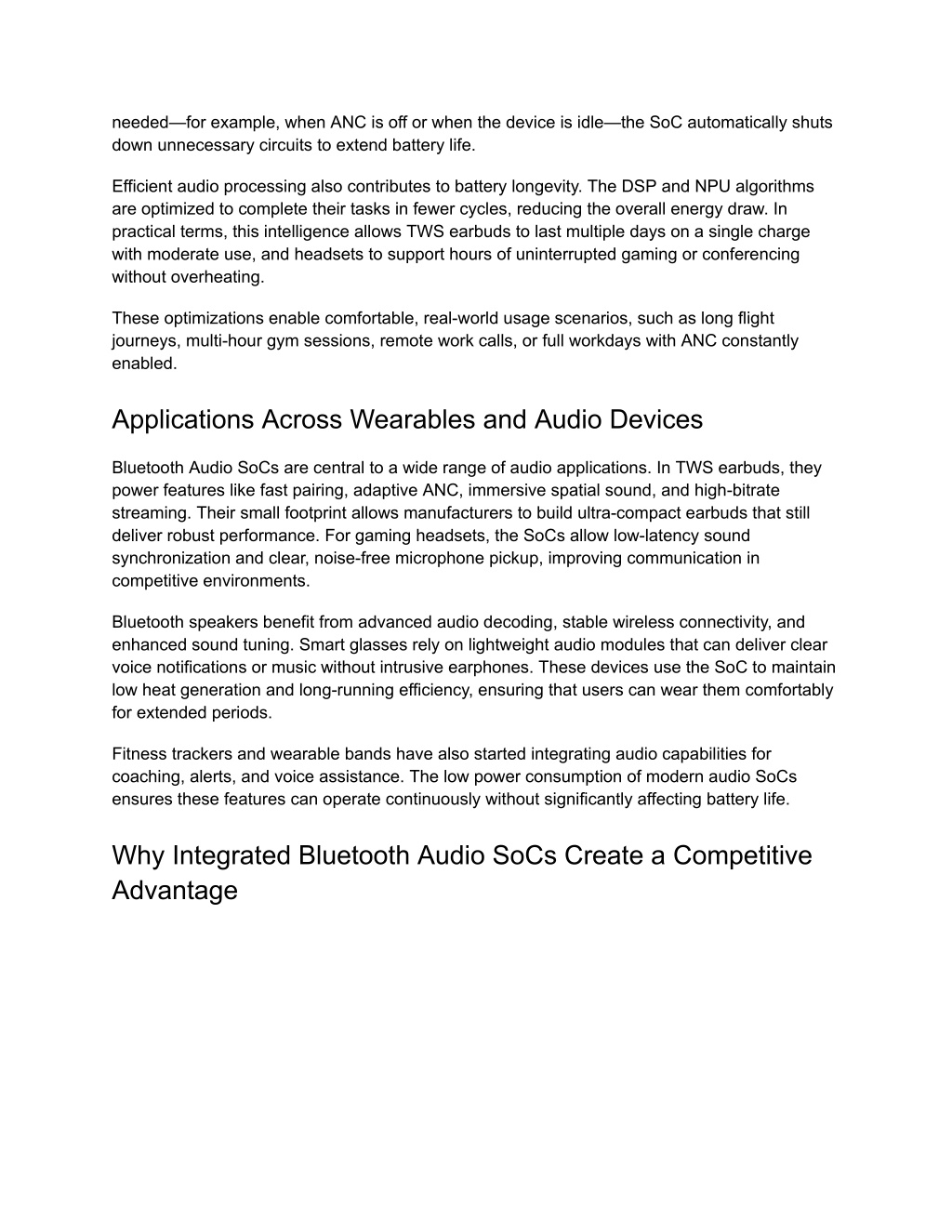 needed—for example, when ANC is off or when the device is idle—the SoC automatically shuts down unnecessary circuits to extend battery life. Efficient audio processing also contributes to battery longevity. The DSP and NPU algorithms are optimized to complete their tasks in fewer cycles, reducing the overall energy draw. In practical terms, this intelligence allows TWS earbuds to last multiple days on a single charge with moderate use, and headsets to support hours of uninterrupted gaming or conferencing without overheating. These optimizations enable comfortable, real-world usage scenarios, such as long flight journeys, multi-hour gym sessions, remote work calls, or full workdays with ANC constantly enabled. Applications Across Wearables and Audio Devices Bluetooth Audio SoCs are central to a wide range of audio applications. In TWS earbuds, they power features like fast pairing, adaptive ANC, immersive spatial sound, and high-bitrate streaming. Their small footprint allows manufacturers to build ultra-compact earbuds that still deliver robust performance. For gaming headsets, the SoCs allow low-latency sound synchronization and clear, noise-free microphone pickup, improving communication in competitive environments. Bluetooth speakers benefit from advanced audio decoding, stable wireless connectivity, and enhanced sound tuning. Smart glasses rely on lightweight audio modules that can deliver clear voice notifications or music without intrusive earphones. These devices use the SoC to maintain low heat generation and long-running efficiency, ensuring that users can wear them comfortably for extended periods. Fitness trackers and wearable bands have also started integrating audio capabilities for coaching, alerts, and voice assistance. The low power consumption of modern audio SoCs ensures these features can operate continuously without significantly affecting battery life. Why Integrated Bluetooth Audio SoCs Create a Competitive Advantage