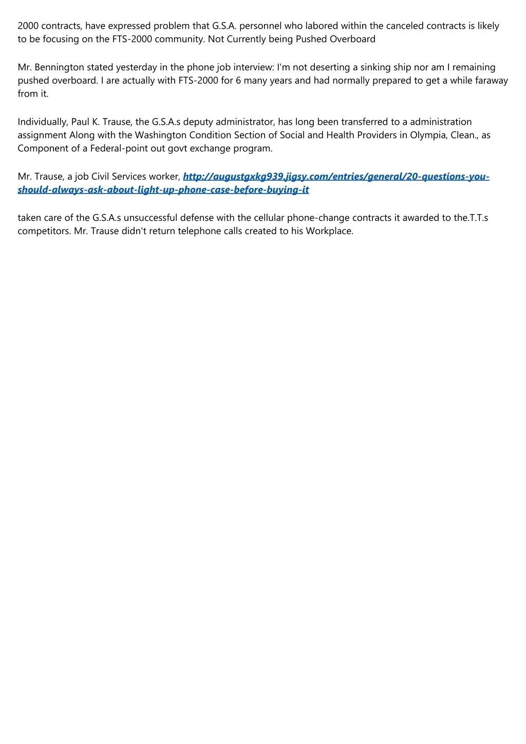2000 contracts, have expressed problem that G.S.A. personnel who labored within the canceled contracts is likely to be focusing on the FTS-2000 community. Not Currently being Pushed Overboard Mr. Bennington stated yesterday in the phone job interview: I'm not deserting a sinking ship nor am I remaining pushed overboard. I are actually with FTS-2000 for 6 many years and had normally prepared to get a while faraway from it. Individually, Paul K. Trause, the G.S.A.s deputy administrator, has long been transferred to a administration assignment Along with the Washington Condition Section of Social and Health Providers in Olympia, Clean., as Component of a Federal-point out govt exchange program. Mr. Trause, a job Civil Services worker, http://augustgxkg939.jigsy.com/entries/general/20-questions-you- should-always-ask-about-light-up-phone-case-before-buying-it taken care of the G.S.A.s unsuccessful defense with the cellular phone-change contracts it awarded to the.T.T.s competitors. Mr. Trause didn't return telephone calls created to his Workplace.