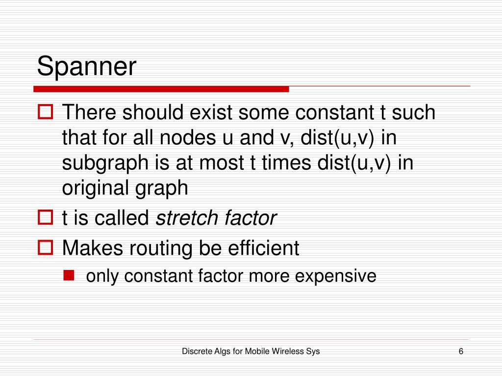 Spanner • There should exist some constant t such that for all nodes u and v, dist(u,v) in subgraph is at most t times dist(u,v) in original graph • t is called stretch factor • Makes routing be efficient • only constant factor more expensive Discrete Algs for Mobile Wireless Sys