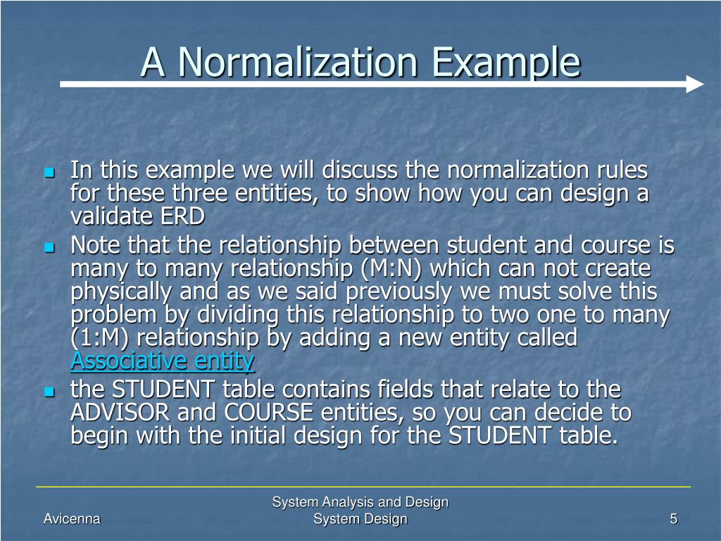 A Normalization Example • A Normalization Example • To show the normalization process, consider the familiar situation which might depict several entities in a school advising system: ADVISOR, COURSE, and STUDENT • The relationships among the three entities are shown in the ERD below [1] System Analysis and Design System Design