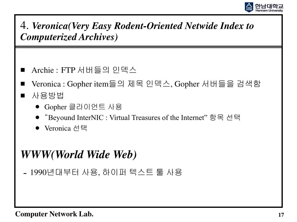 4. Veronica(Very Easy Rodent-Oriented Netwide Index to Computerized Archives) • Archie :FTP 서버들의 인덱스 • Veronica : Gopher item들의 제목 인덱스, Gopher 서버들을 검색함 • 사용방법 • Gopher 클라이언트 사용 • “Beyound InterNIC : Virtual Treasures of the Internet” 항목 선택 • Veronica 선택 WWW(World Wide Web) - 1990년대부터 사용, 하이퍼 텍스트 툴 사용