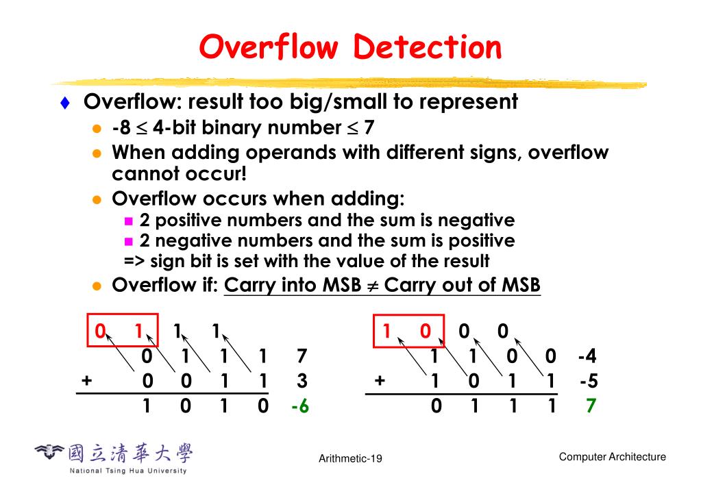 Overflow Decimal Binary Decimal 2’s complement 0 0000 0 0000 1 0001 -1 1111 2 0010 -2 1110 3 0011 -3 1101 4 0100 -4 1100 5 0101 -5 1011 6 0110 -6 1010 7 0111 -7 1001 -8 1000 Ex: 7 + 3 = 10 but ... - 4 - 5 = - 9 but … 0 1 1 1 1 0 0 0 0 1 1 1 7 1 1 0 0 -4 + 0 0 1 1 3 + 1 0 1 1 -5 1 0 1 0 -60 1 11 7 Arithmetic-18