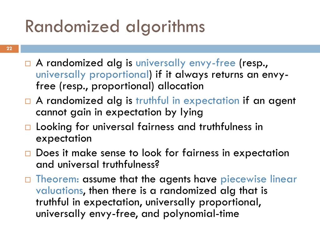Randomized algorithms • A randomized alg is universally envy-free (resp., universally proportional) if it always returns an envy-free (resp., proportional) allocation • A randomized alg is truthful in expectation if an agent cannot gain in expectation by lying • Looking for universal fairness and truthfulness in expectation • Does it make sense to look for fairness in expectation and universal truthfulness? • Theorem: assume that the agents have piecewise linear valuations, then there is a randomized alg that is truthful in expectation, universally proportional, universally envy-free, and polynomial-time