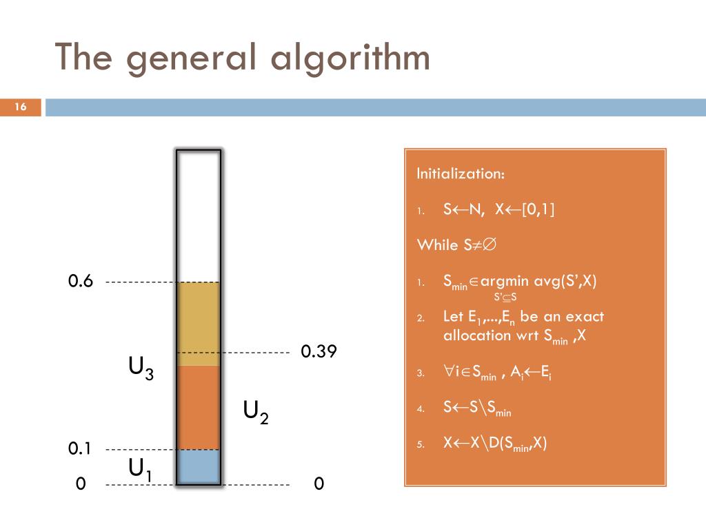 The general algorithm • Initialization: • SN, X[0,1] • While S • Sminargminavg(S’,X) • Let E1,...,En be an exact allocation wrt Smin,X • iSmin , AiEi • SS\Smin • XX\D(Smin,X) 0.6 S’S 0.39 U3 U2 0.1 U1 0 0