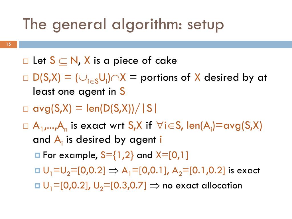 The general algorithm: setup • Let S N, X is a piece of cake • D(S,X) = (iSUi)X = portions of X desired by at least one agent in S • avg(S,X) = len(D(S,X))/|S| • A1,...,Anis exact wrt S,X if iS, len(Ai)=avg(S,X) and Ai is desired by agent i • For example, S={1,2} and X=[0,1] • U1=U2=[0,0.2] A1=[0,0.1], A2=[0.1,0.2] is exact • U1=[0,0.2], U2=[0.3,0.7] no exact allocation