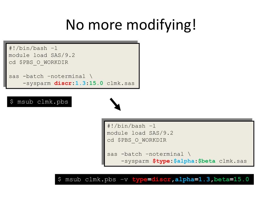 No more modifying! #!/bin/bash –l module load SAS/9.2 cd $PBS_O_WORKDIR sas -batch –noterminal \ -sysparmdiscr:1.3:15.0 clmk.sas $ msub clmk.pbs #!/bin/bash –l module load SAS/9.2 cd $PBS_O_WORKDIR sas -batch –noterminal \ -sysparm$type:$alpha:$beta clmk.sas $ msub clmk.pbs –v type=discr,alpha=1.3,beta=15.0