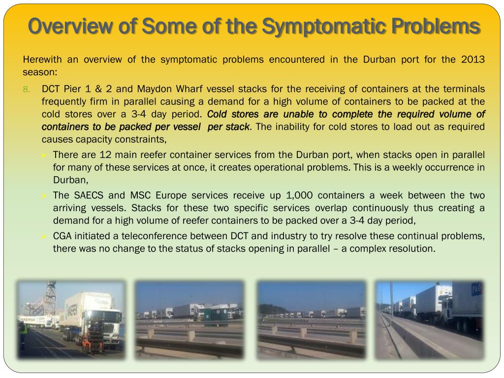 Overview of Some of the Symptomatic Problems Herewith an overview of the symptomatic problems encountered in the Durban port for the 2013 season: • DCT Pier 1 & 2 and Maydon Wharf vessel stacks for the receiving of containers at the terminals frequently firm in parallel causing a demand for a high volume of containers to be packed at the cold stores over a 3-4 day period. Cold stores are unable to complete the required volume of containers to be packed per vessel per stack. The inability for cold stores to load out as required causes capacity constraints, • There are 12 main reefer container services from the Durban port, when stacks open in parallel for many of these services at once, it creates operational problems. This is a weekly occurrence in Durban, • The SAECS and MSC Europe services receive up 1,000 containers a week between the two arriving vessels. Stacks for these two specific services overlap continuously thus creating a demand for a high volume of reefer containers to be packed over a 3-4 day period, • CGA initiated a teleconference between DCT and industry to try resolve these continual problems, there was no change to the status of stacks opening in parallel – a complex resolution.