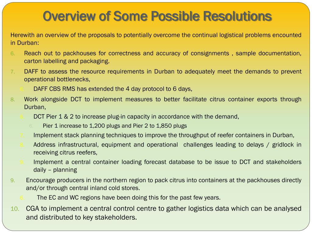 Overview of Some Possible Resolutions Herewith an overview of the proposals to potentially overcome the continual logistical problems encounted in Durban: • Reach out to packhouses for correctness and accuracy of consignments , sample documentation, carton labelling and packaging. • DAFF to assess the resource requirements in Durban to adequately meet the demands to prevent operational bottlenecks, • DAFF CBS RMS has extended the 4 day protocol to 6 days, • Work alongside DCT to implement measures to better facilitate citrus container exports through Durban, • DCT Pier 1 & 2 to increase plug-in capacity in accordance with the demand, • Pier 1 increase to 1,200 plugs and Pier 2 to 1,850 plugs • Implement stack planning techniques to improve the throughput of reefer containers in Durban, • Address infrastructural, equipment and operational challenges leading to delays / gridlock in receiving citrus reefers, • Implement a central container loading forecast database to be issue to DCT and stakeholders daily – planning • Encourage producers in the northern region to pack citrus into containers at the packhouses directly and/or through central inland cold stores. • The EC and WC regions have been doing this for the past few years. • CGA to implement a central control centre to gather logistics data which can be analysed and distributed to key stakeholders.