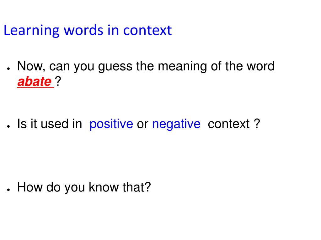 Learning words in context Now, can you guess the meaning of the word abate ? Is it used in positive or negative context ? How do you know that?