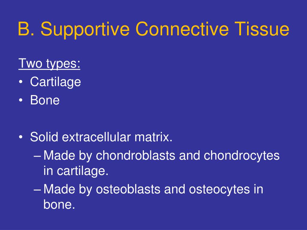 B. Supportive Connective Tissue Two types: • Cartilage • Bone • Solid extracellular matrix. • Made by chondroblasts and chondrocytes in cartilage. • Made by osteoblasts and osteocytes in bone.