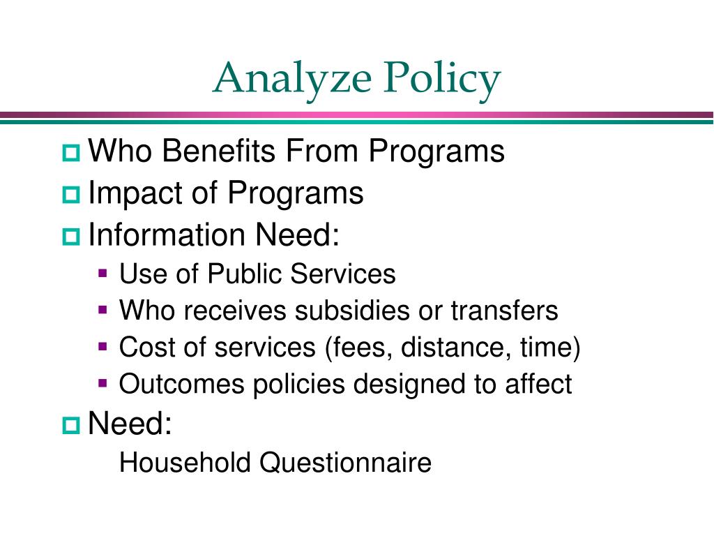 Analyze Policy • Who Benefits From Programs • Impact of Programs • Information Need: • Use of Public Services • Who receives subsidies or transfers • Cost of services (fees, distance, time) • Outcomes policies designed to affect • Need: • Household Questionnaire