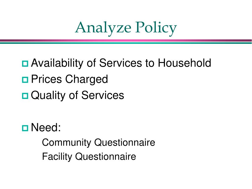 Analyze Policy • Availability of Services to Household • Prices Charged • Quality of Services • Need: • Community Questionnaire • Facility Questionnaire