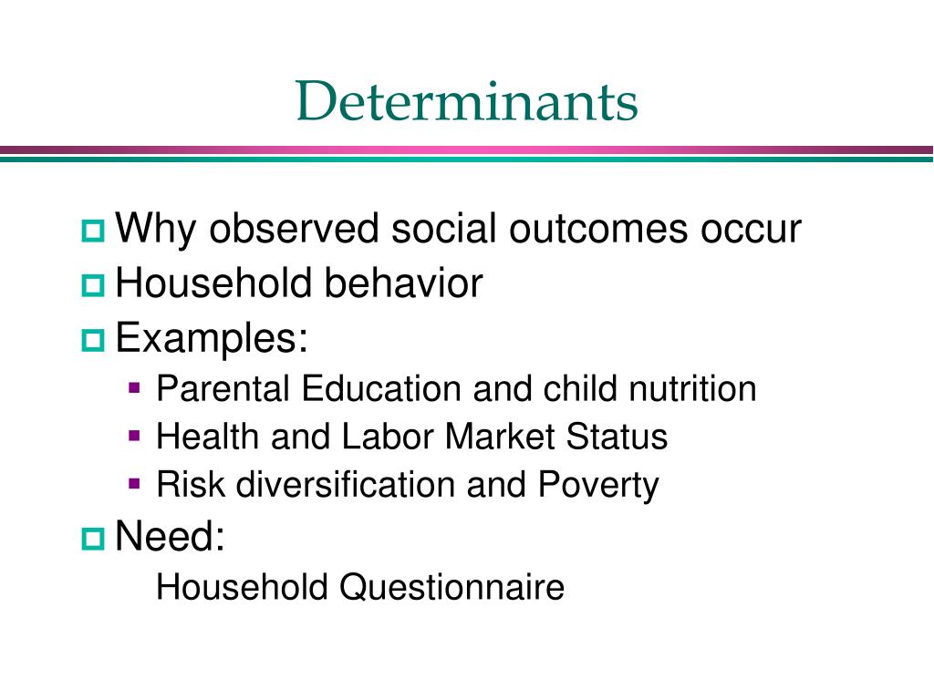 Determinants • Why observed social outcomes occur • Household behavior • Examples: • Parental Education and child nutrition • Health and Labor Market Status • Risk diversification and Poverty • Need: • Household Questionnaire