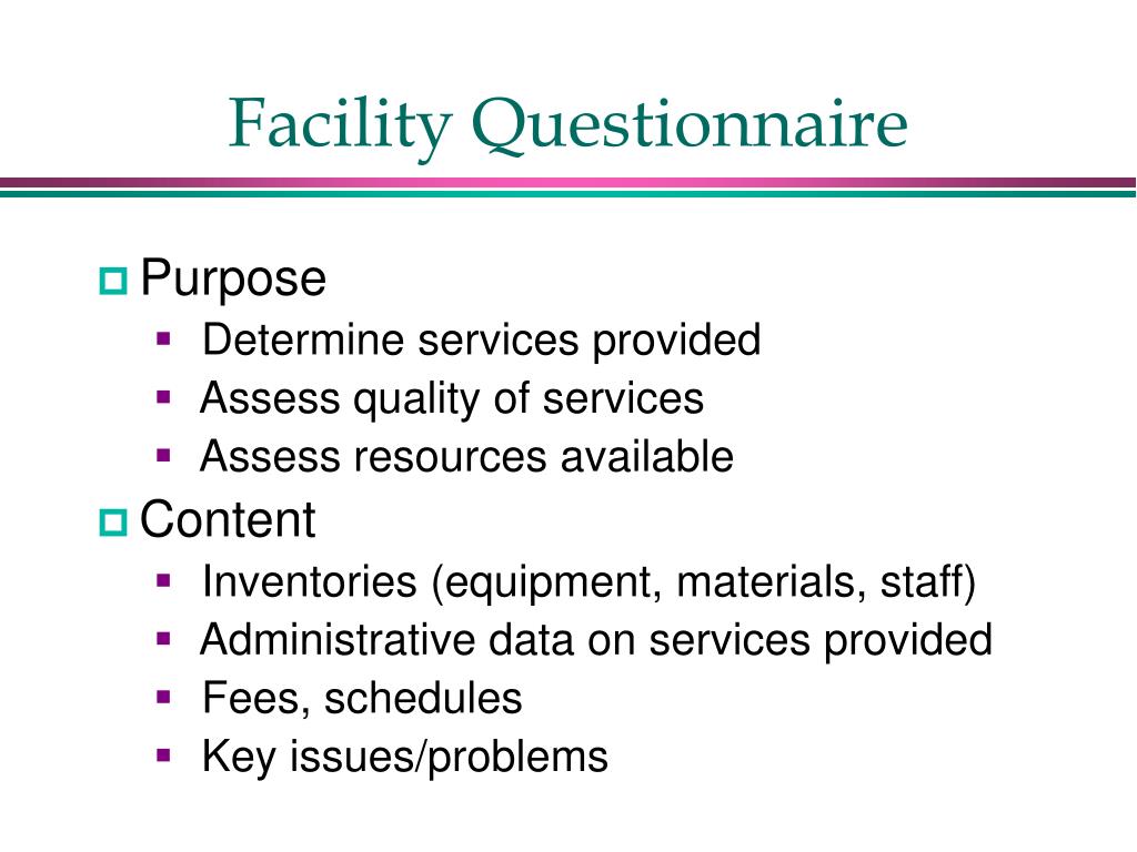 Facility Questionnaire • Purpose • Determine services provided • Assess quality of services • Assess resources available • Content • Inventories (equipment, materials, staff) • Administrative data on services provided • Fees, schedules • Key issues/problems