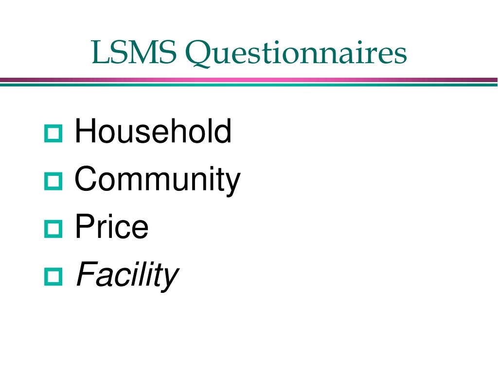 Designing LSMS Questionnaires. Kinnon Scott Gero Carletto DECRG. LSMS Questionnaires. Household Community Price Facility. Purposes of LSMS Surveys. Measure Welfare. Welfare. Measure Levels, Distribution, Causes Various measures Consumption Income