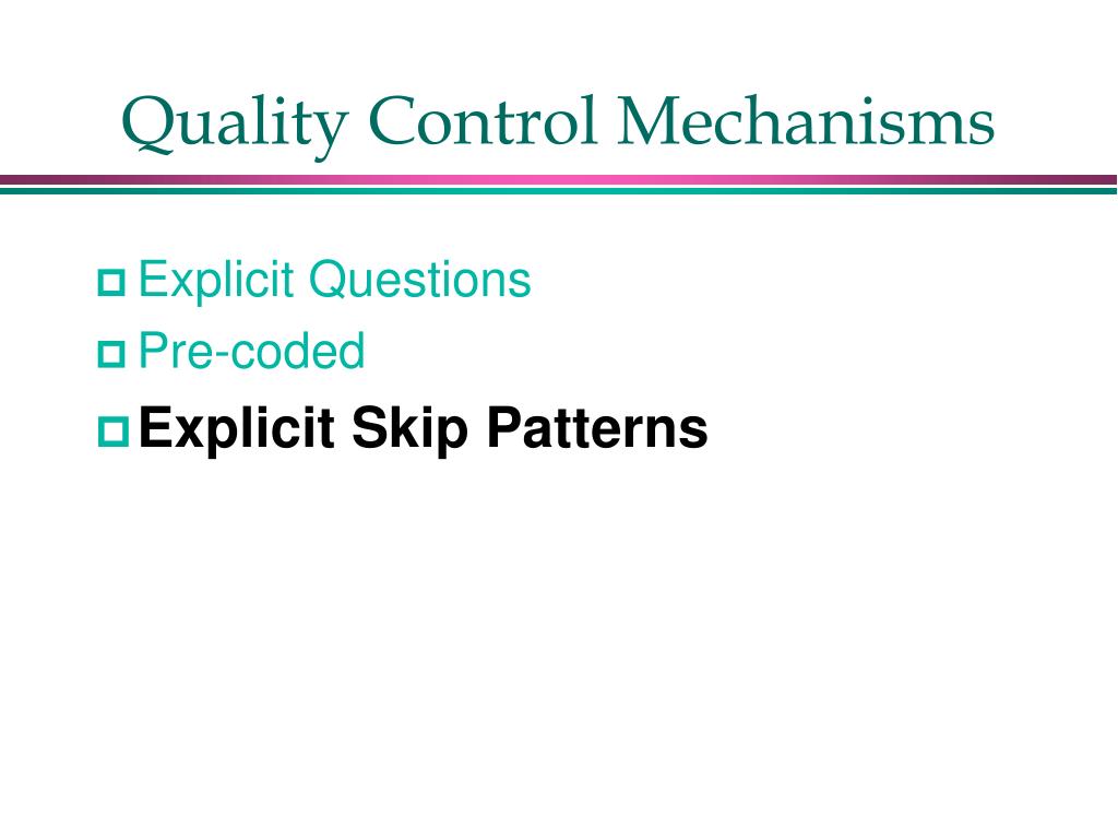 Quality Control Mechanisms • Explicit Questions • Pre-coded • Explicit Skip Patterns