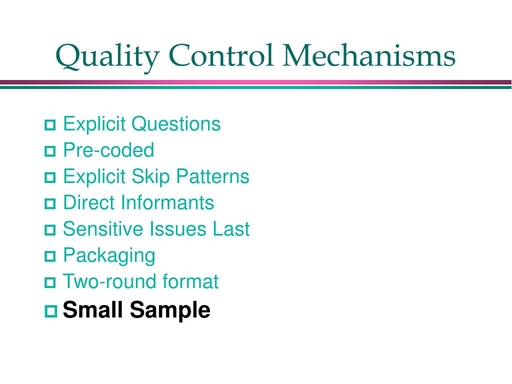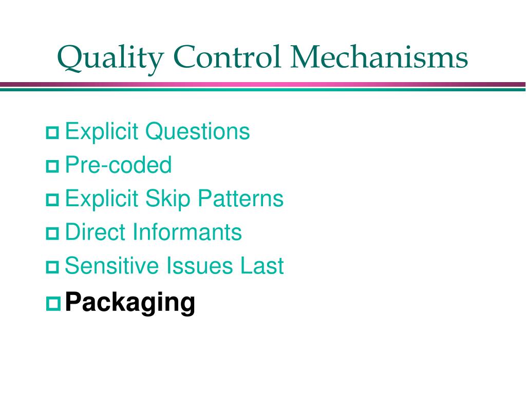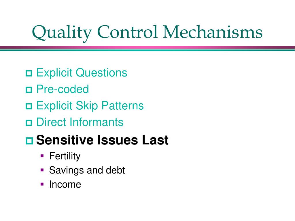 Quality Control Mechanisms • Explicit Questions • Pre-coded • Explicit Skip Patterns • Direct Informants • Sensitive Issues Last • Packaging • Two-round format