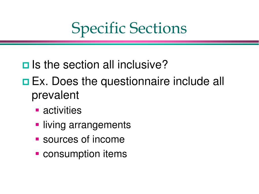 Specific Sections • Is the section all inclusive? • Ex. Does the questionnaire include all prevalent • activities • living arrangements • sources of income • consumption items