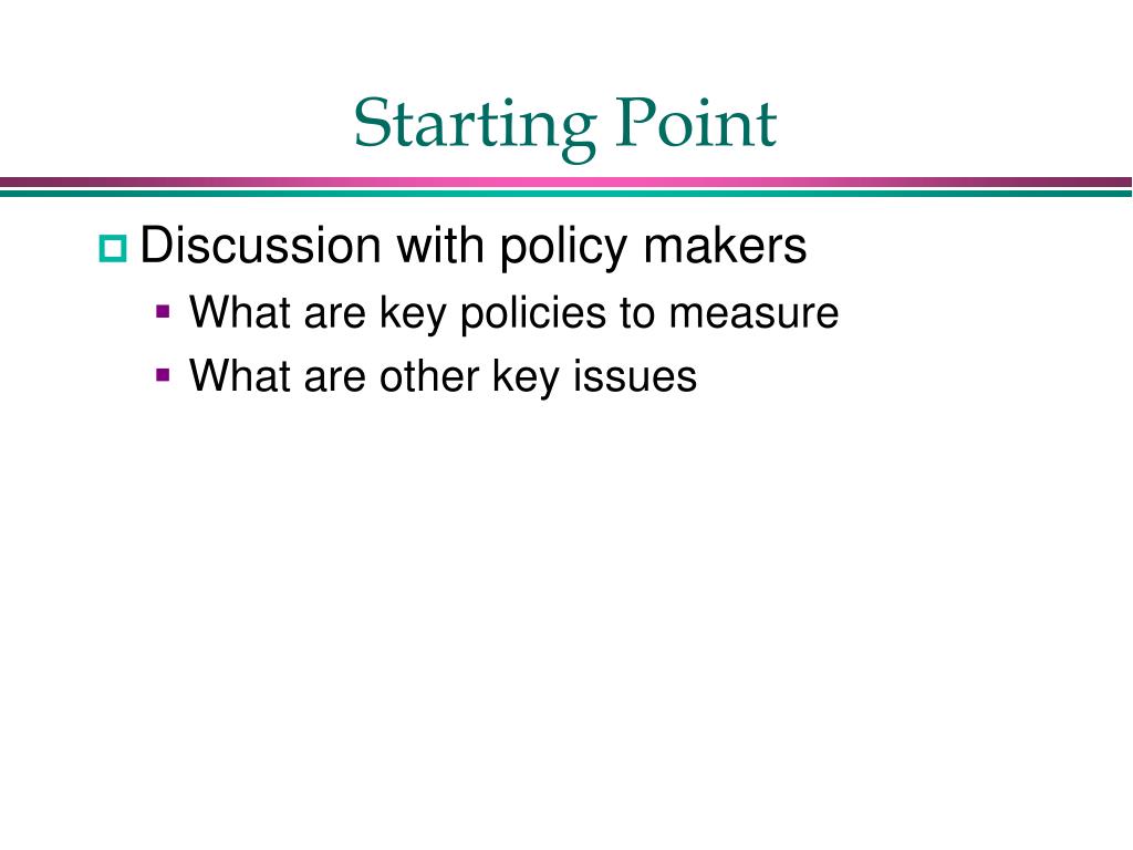 Starting Point • Discussion with policy makers • What are key policies to measure • What are other key issues